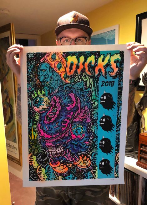 The music of Phish is particularly interesting and diverse because it allows its listeners to pick out their favorite parts from the community and use it in their own lives and work. Nick DiFabbio greatly enjoys the music itself, but he really loves the fantasy aspects of Phish’s visuals and the cartoonish vibes they give off to him. It is these types of visuals that influence the different types of art that DiFabbio makes. While DiFabbio makes art on a plethora of mediums, all of his art shares similar themes. He has this pop art style about his work that appears to give funny, larger than life definition to subjects that otherwise are considered to be strange, weird, and grotesque by the majority of society.