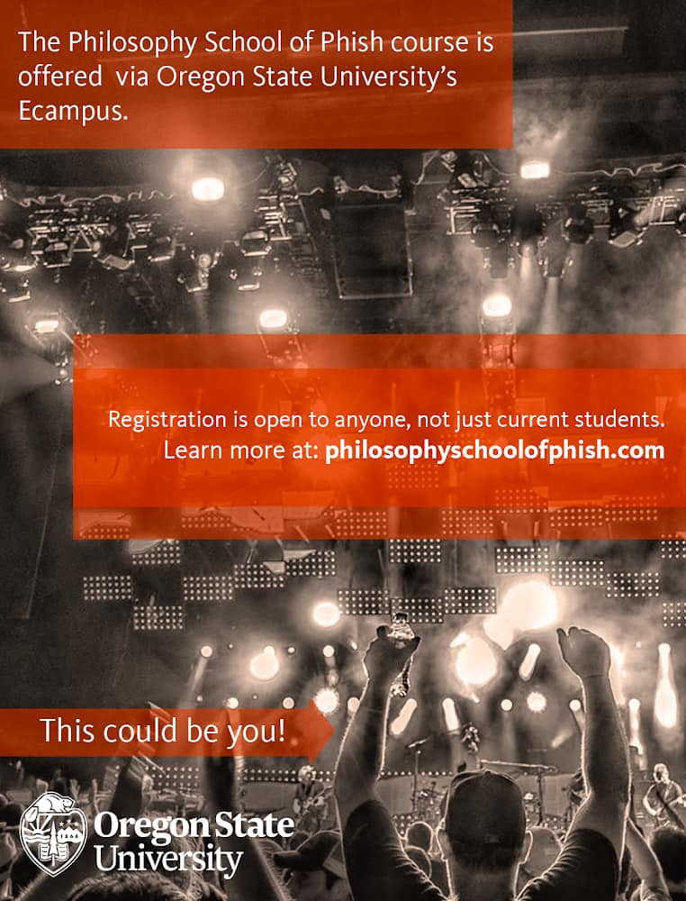 Registration is now open for the “Philosophy School of Phish,” a special section of PHL 360: Philosophy and the Arts at Oregon State University, which is now in its 12th year. The class merges the experience of Phish’s live performances with the study of theories about art, aesthetic judgment, community, and more. It is designed as a philosophy of music class, and will incorporate live Phish performances as case studies.